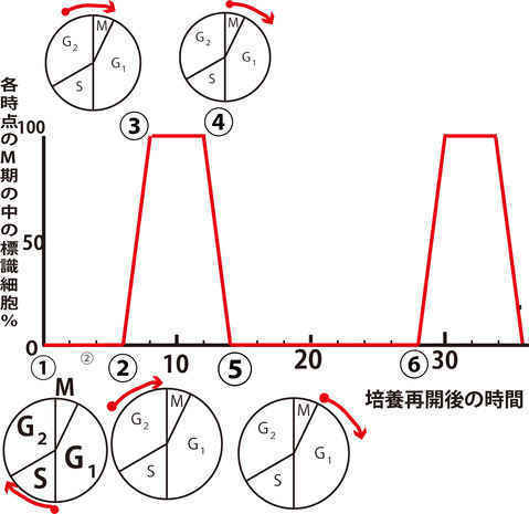 グラフの縦軸は細胞あたりのdna量、横軸は時間を表しています。 卵割にはg 1 期とg 2 期がなく、s期とm期だけが繰り返されるという特徴がありました。 グラフを1つずつ確認していきましょう。 細胞周期の時間は同じだが、非同調に細胞周期を繰り返している多数の細胞集団がある。 3hチミジンを短時間、細胞集団に投与した後 時間経過とm期の細胞で3hの放射能を示した染色体を含んだ細胞の割合を調べたのが下の図。 3時間後に出現し始めて4時間後